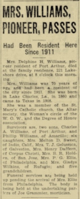 She was indeed a pioneer Port Arthur resident, and I’m sure she was a faithful mother and a member of the altar society at St Mary’s. But Delphine Williams carried an important secret to the grave with her. Few could have known.