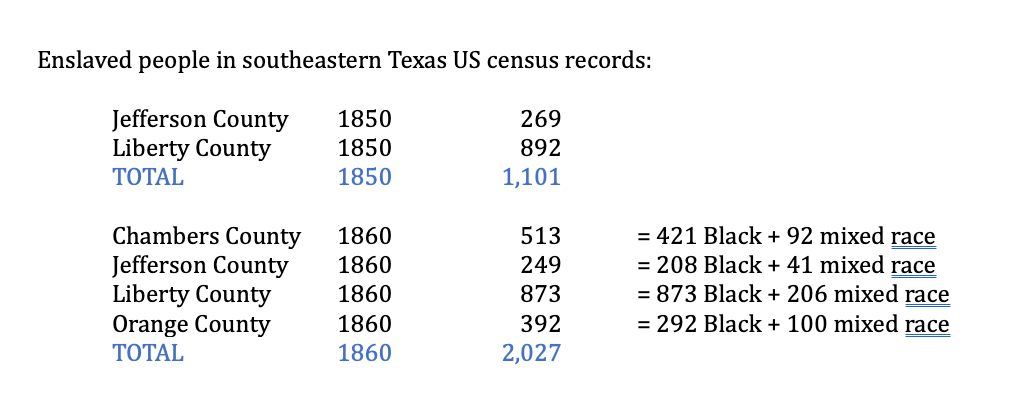 I describe southeastern Texas – for this project – as including Jefferson, Orange, Chambers, and Liberty counties. In 1850 at the time of the first US census for Texas, only Jefferson and Liberty counties existed. But I find a big anomaly between numbers of enslaved people in Jefferson and Liberty counties in 1850 and then in 1860, the last US census showing enslaved people.