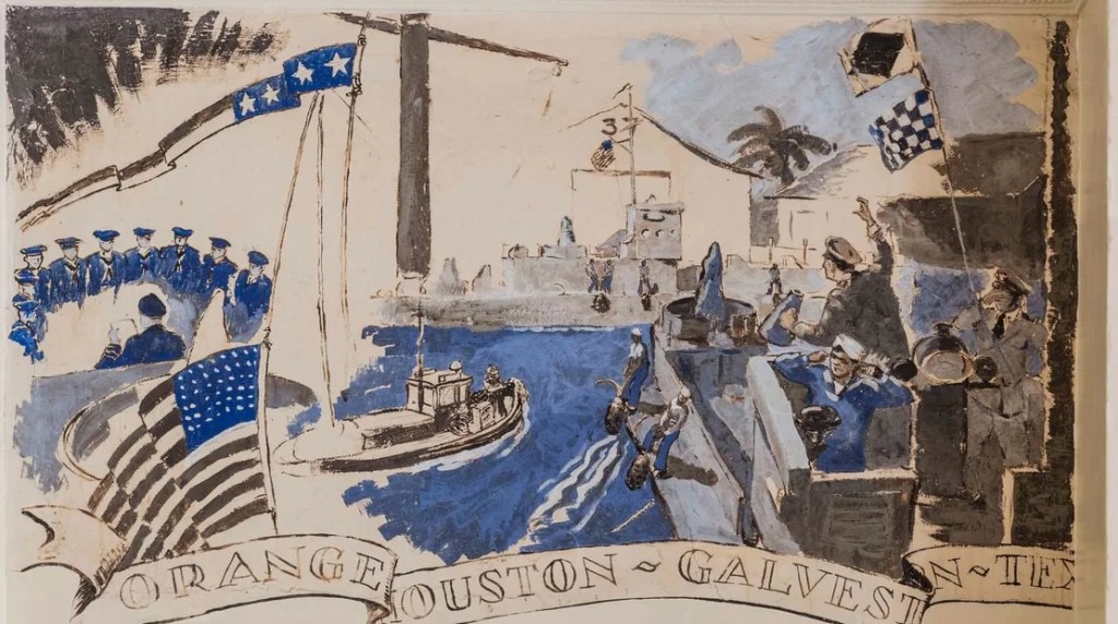 The friezes in the library begin with this image depicting the construction of their ships in Orange, Texas, and the initial—and apparently disastrous—trials of the ships in Galveston Bay. This image depicts an officer with arms raised screaming at ships’ crews!